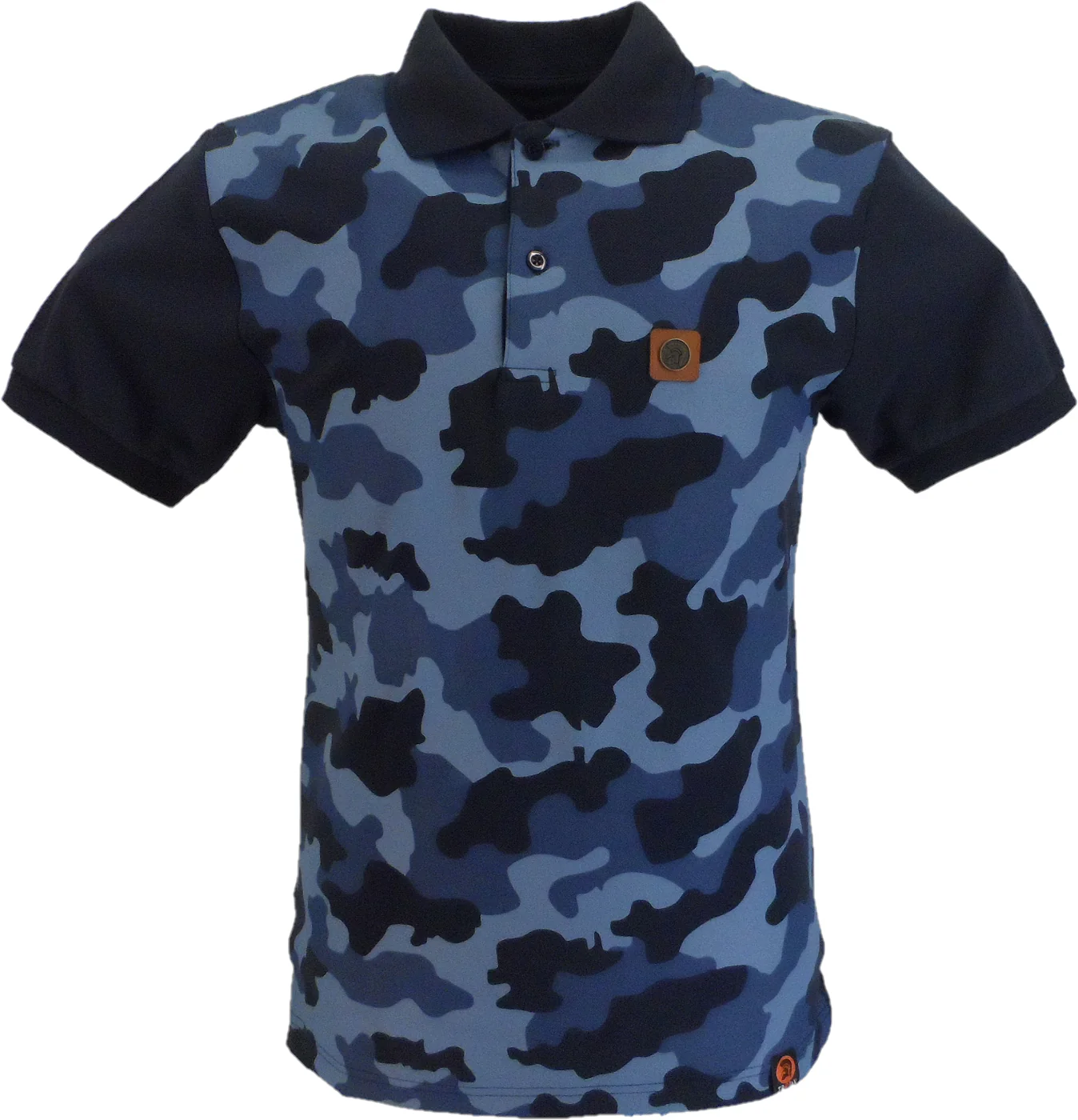 Cotton pique polo, with printed ‘camo’ front panel, with Trojan helmet metal badge on chest and woven Trojan label at hem. and Self colour twin-tipping to collar and cuffs