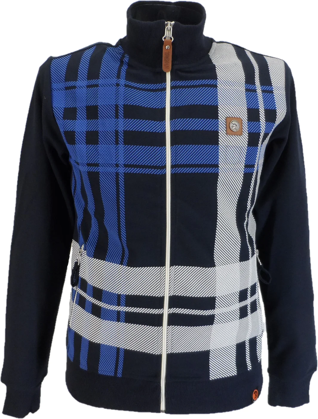 Retro knit track top, with oversize house check, raised print front panel, with rib collar, cuffs, and hem, zip pockets, with Trojan embossed zip-puller, a metal badge to chest, and woven label at hem.