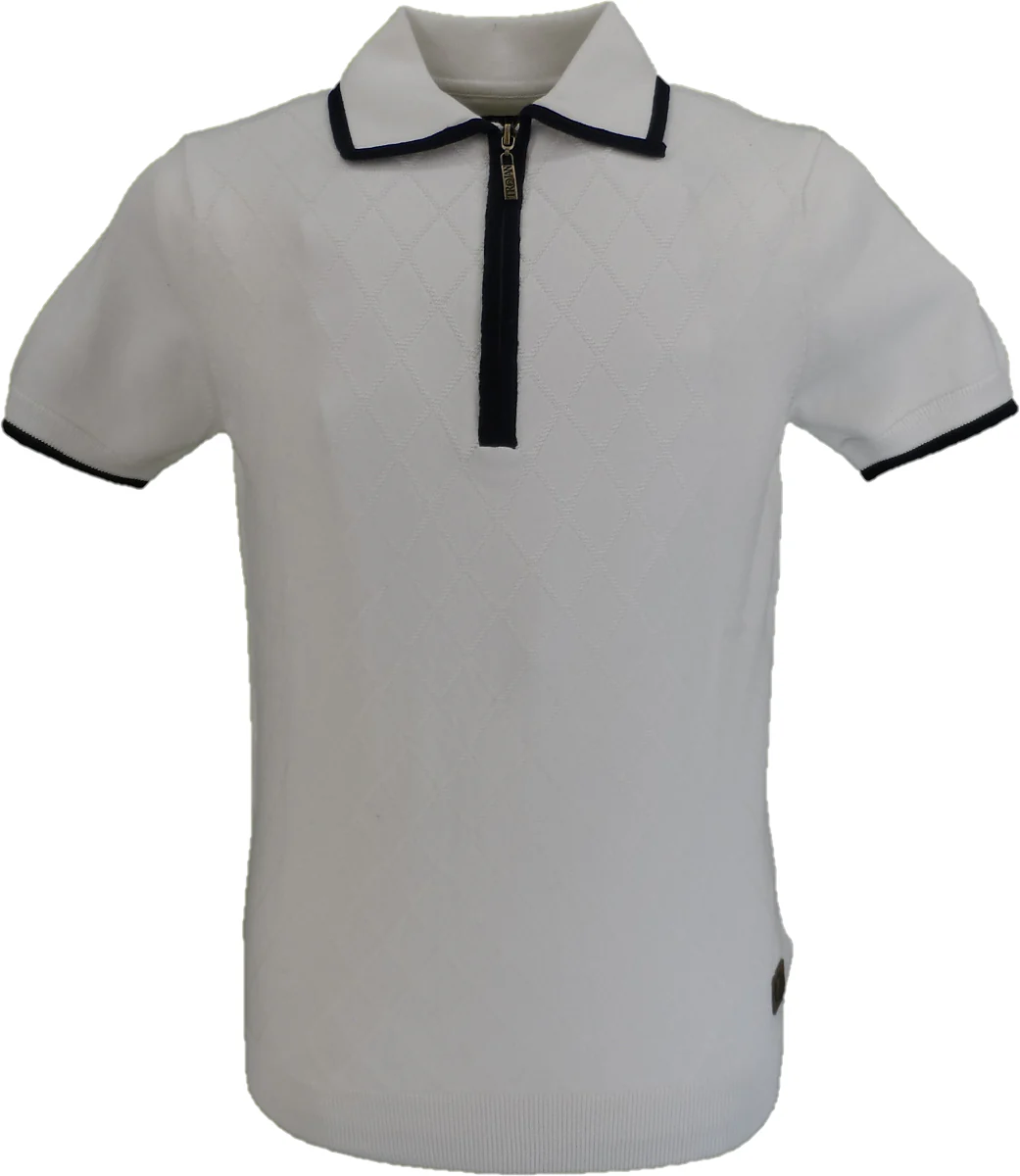 Trojan Records Mens Ecru Diamond Zipped Knitted Polo Shirt