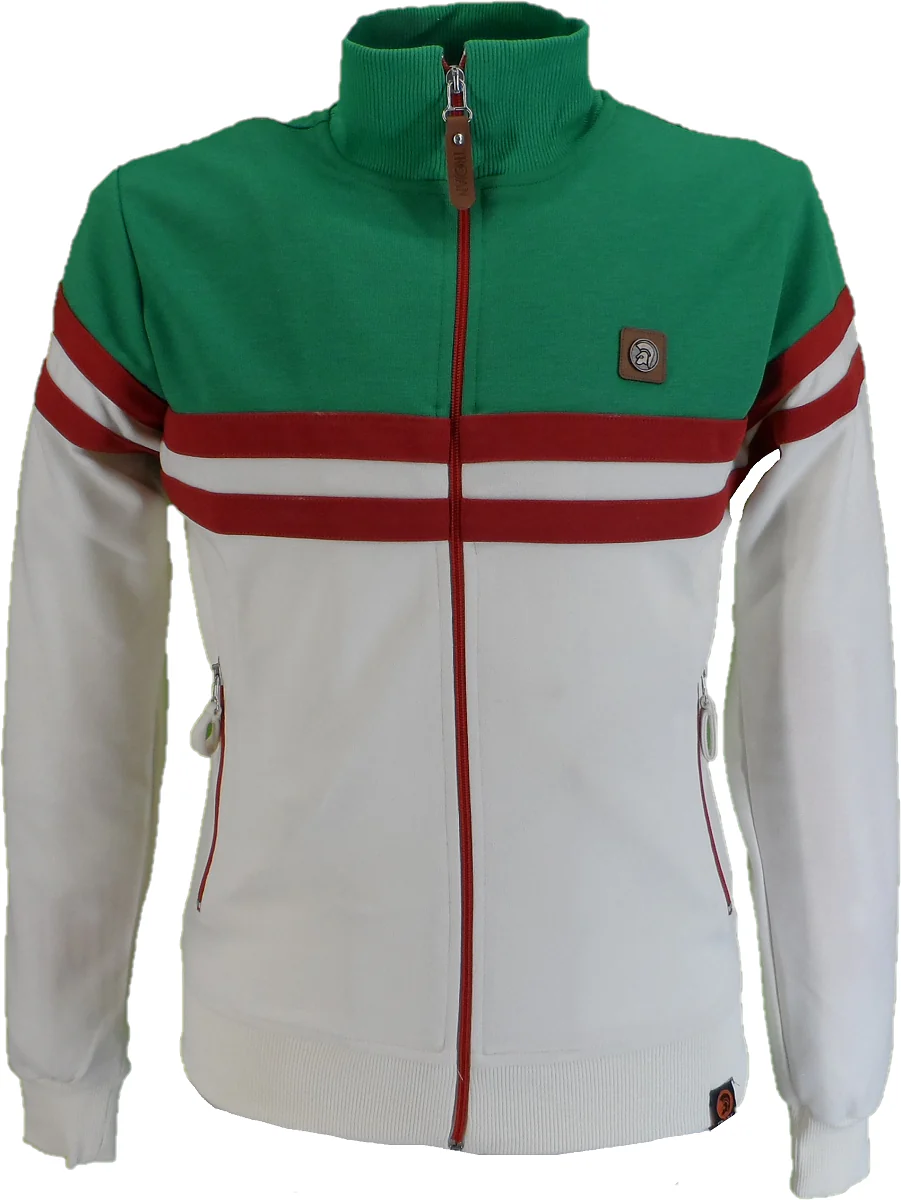 Retro knit track top, with cut and sew color-block panels, with laid-on stripe detail to sleeve, front, and back, with contrast zip and zip pockets, with Trojan embossed zip-puller, a metal badge to the chest, and woven label at hem.