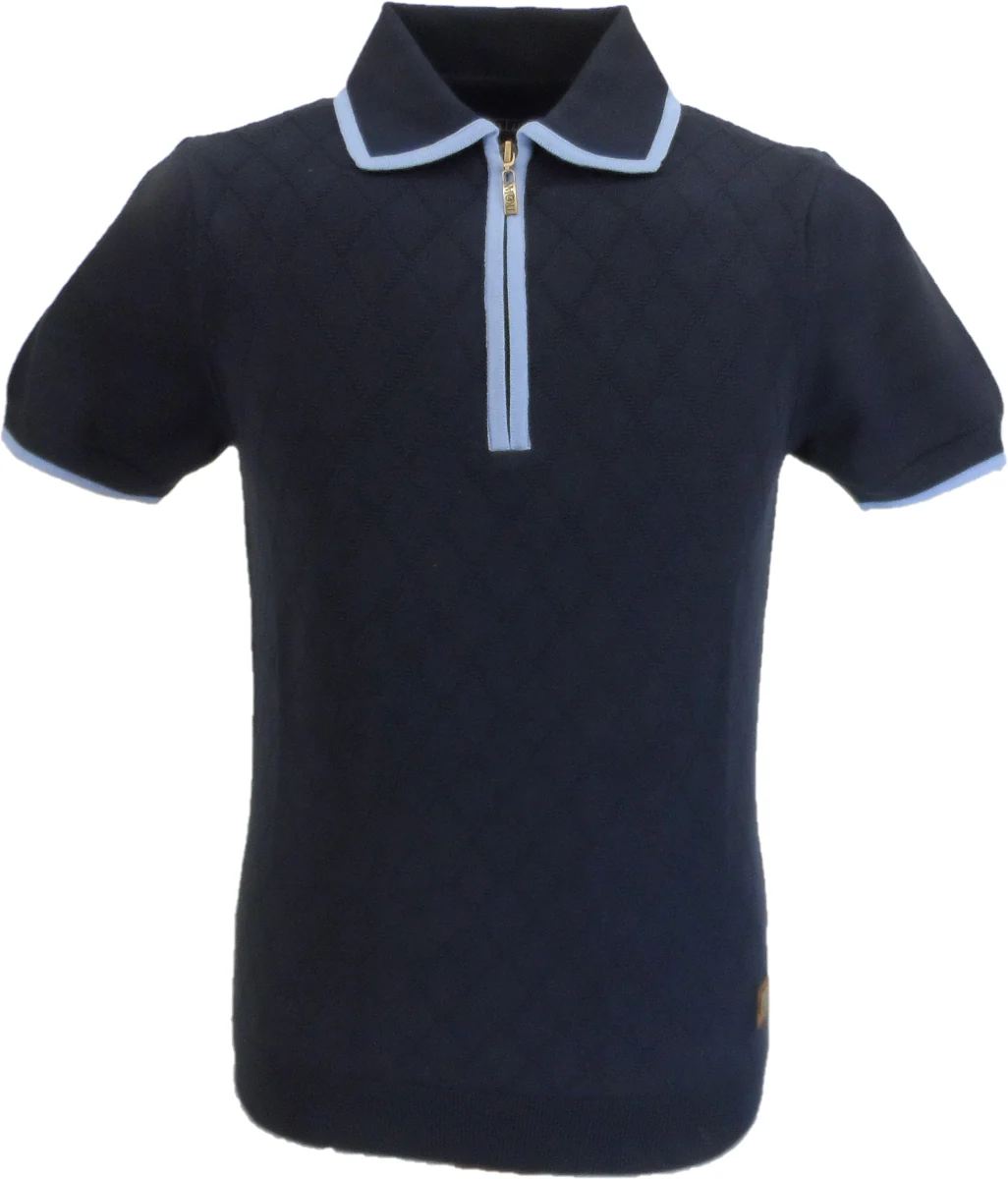 Trojan Records Mens Navy Blue Diamond Zipped Knitted Polo Shirt