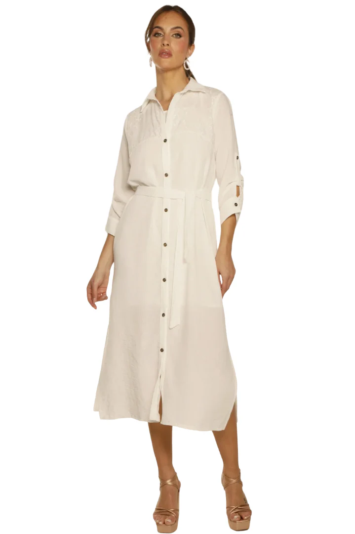 | Tipo de ajuste | Ceñido en el busto y cintura, con caída fluida a lo largo de la cadera y piernas. |